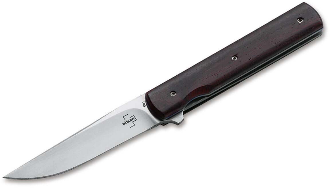 The Boker Plus Urban Trapper, designed by Brad Zinker, is equipped with a reliable linerlock in this somewhat more tangible version and is thus available with an additional locking mechanism. The elegant pocket knife is equipped with a blade made of VG-10, which has a hairline finish and a hollow grinding and is opened by a flipper with ball bearings. The dark cocobolo wood handle scales have a fine grain and underline the noble character of the gentleman’s folder. The spacer and the stable titanium liners are anodised in blue and thus match the colour of the deep carry clip (tip-up/r), which is also made of titanium. With high-quality nylon case for storage. Specifications for Boker Plus Urban Trapper Linear Folding Knife by Brad Zinker: Manufacturer: Boker Plus Blade Length: 3.27 in Closed Length: 4 in Blade Material: VG-10 Designer: Brad Zinker Knife Application: Pocket Knife Overall Length: 7.28 in Handle Material: Cocobolo Wood Blade Finish: Uncoated Blade Thickness: 0.1 in Lock Type: Linerlock Sheath Material: No Sheath Handle Color: Brown Weight: 1.83 oz Opening Method: Manual Color: Brown Blade Type: Straight Back Package Contents: Boker Plus Urban Trapper Linear Folding Knife by Brad Zinker Pouch